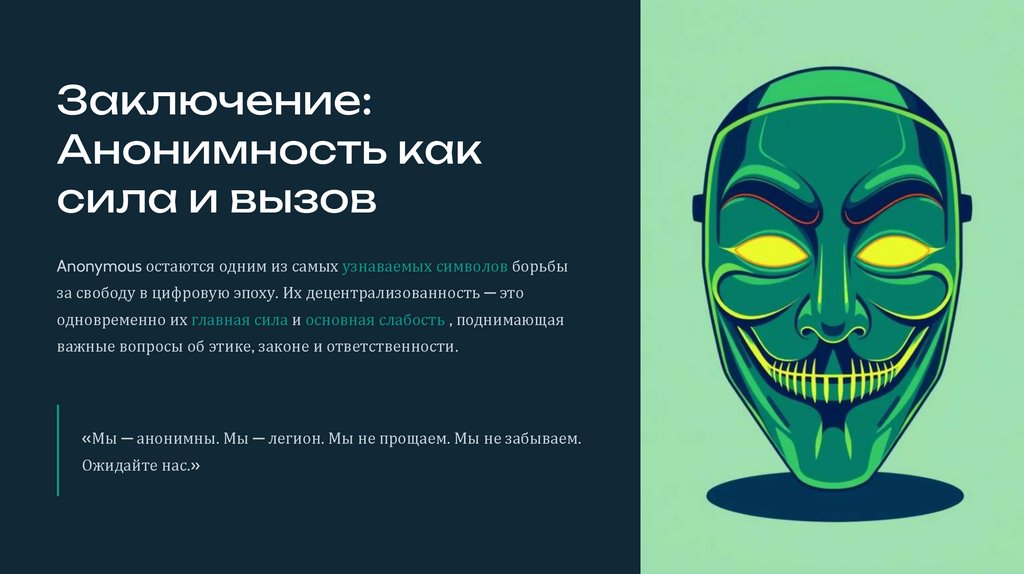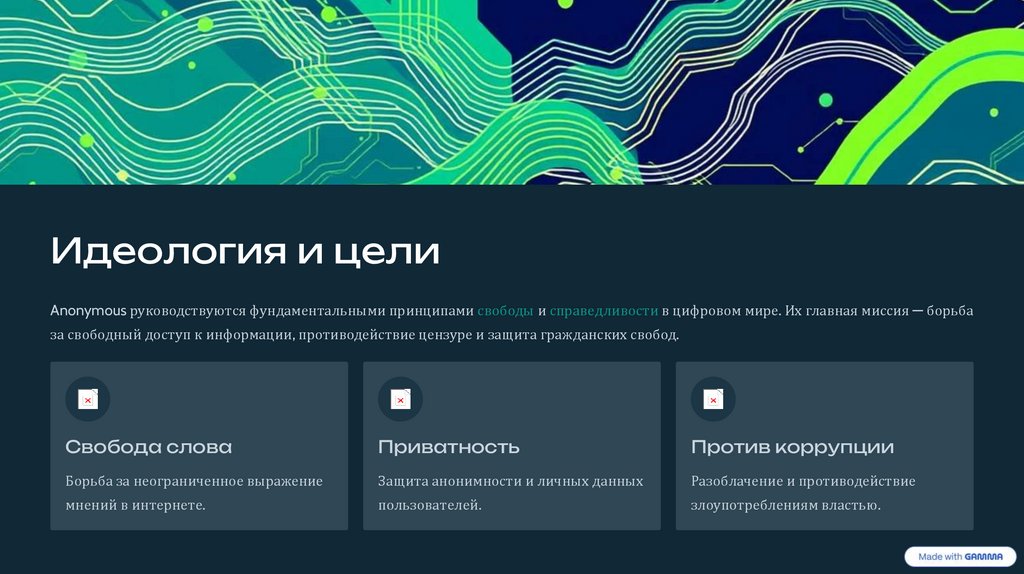 Идеология и целиAnonymous руководствуются фундаментальными принципами свободы и справедливости в цифровом мире. Их главная миссия — борьба