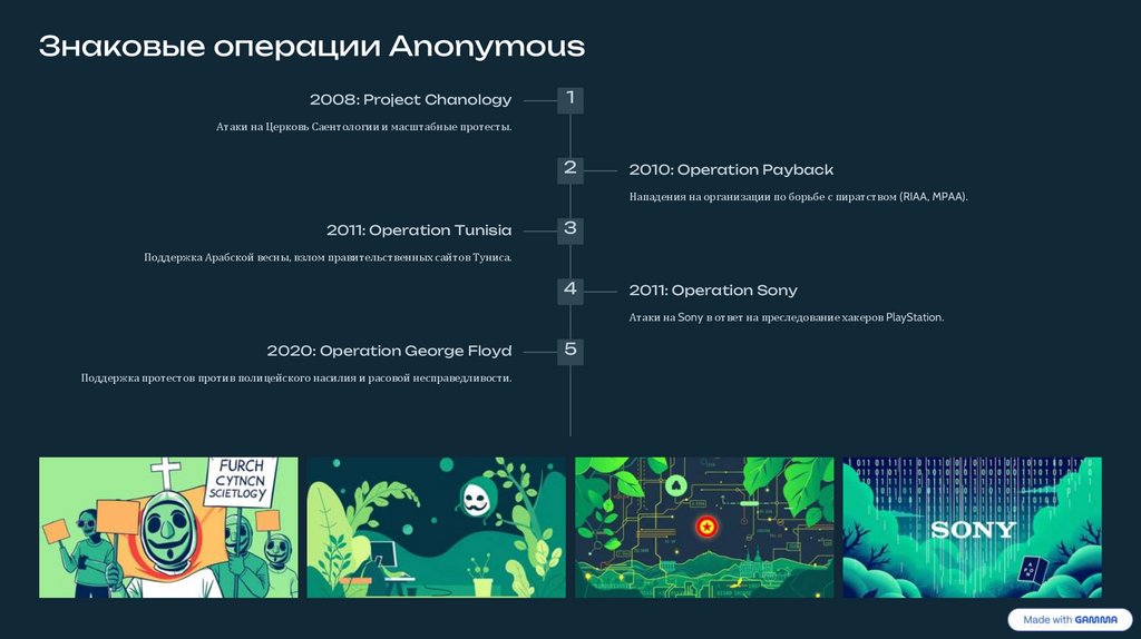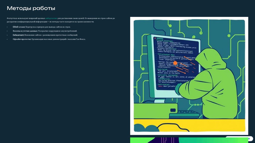 Методы работыAnonymous используют широкий арсенал кибертактик для достижения своих целей. От выведения из строя сайтов до