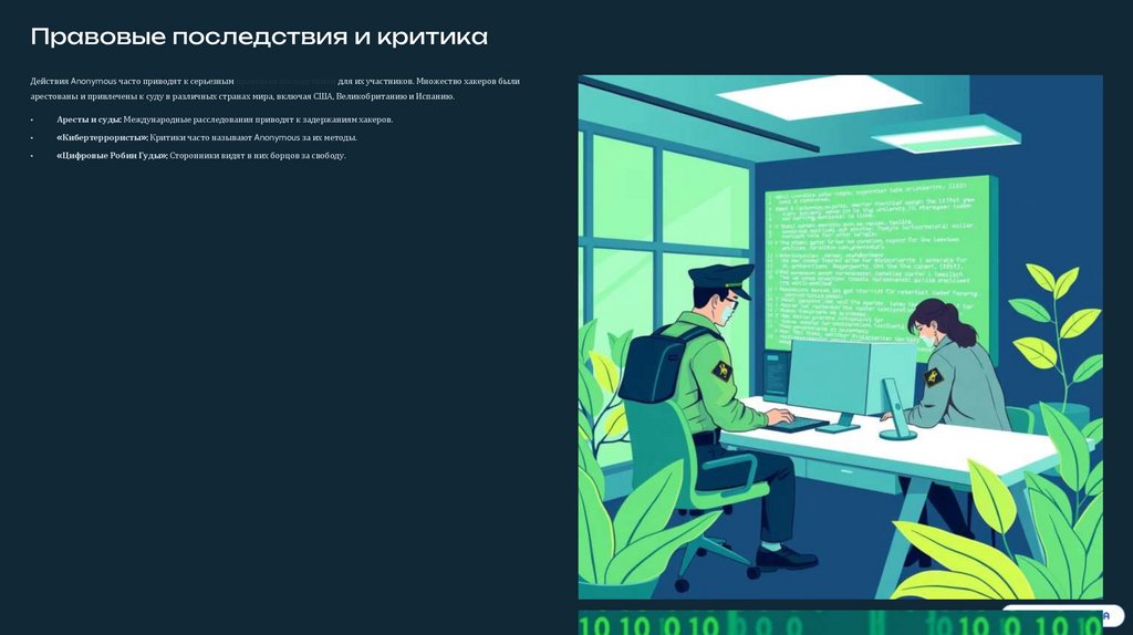 Правовые последствия и критикаДействия Anonymous часто приводят к серьезным правовым последствиям для их участников. Множество хакеров были