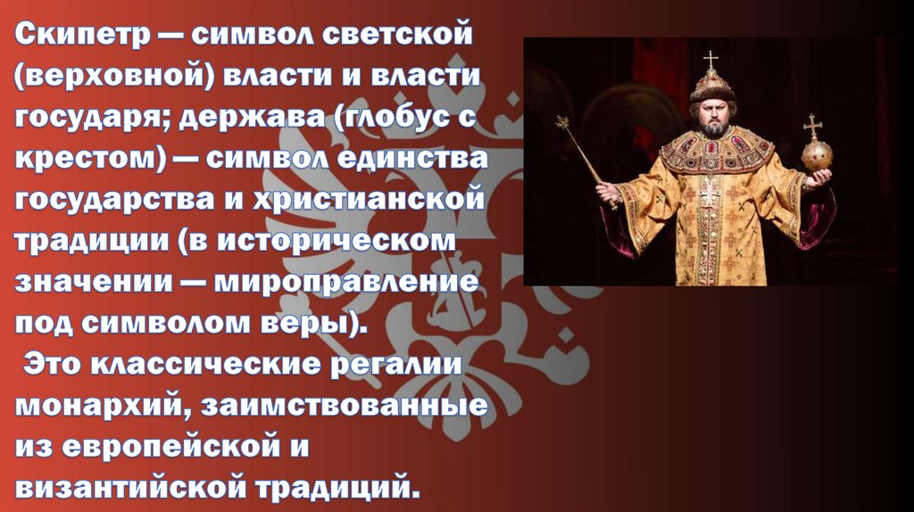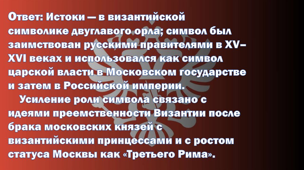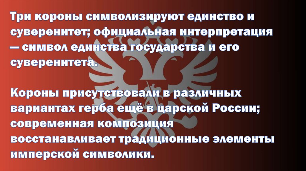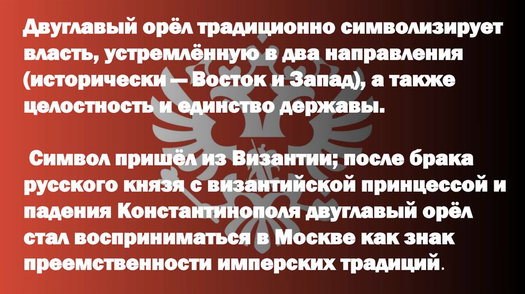 Двуглавый орёл традиционно символизируетвласть, устремлённую в два направления