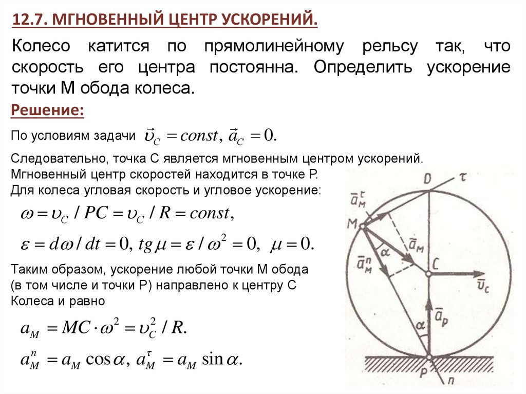 12.7. МГНОВЕННЫЙ ЦЕНТР УСКОРЕНИЙ.Колесо катится по прямолинейному рельсу так, что