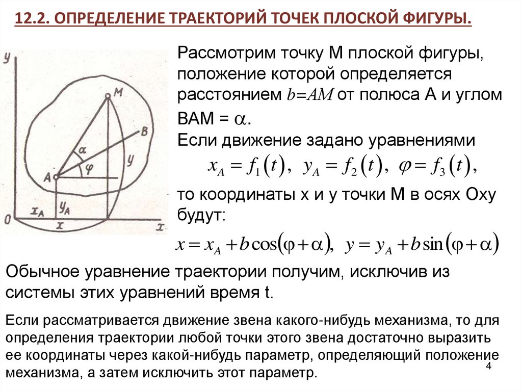 12.2. ОПРЕДЕЛЕНИЕ ТРАЕКТОРИЙ ТОЧЕК ПЛОСКОЙ ФИГУРЫ.Рассмотрим точку М плоской фигуры,