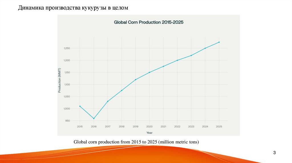 Динамика производства кукурузы в целомGlobal corn production from 2015 to 2025 (million metric tons)
