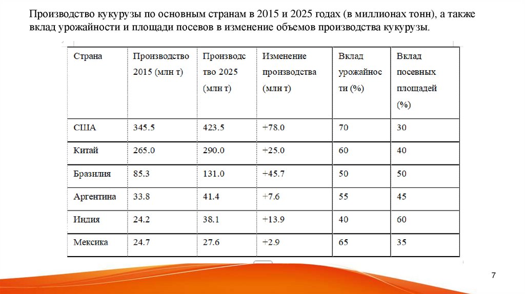 Производство кукурузы по основным странам в 2015 и 2025 годах (в миллионах тонн), а такжевклад урожайности и площади посевов в изменение объемов производства кукурузы.