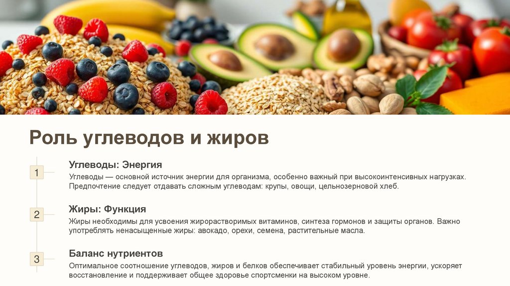 Оптимальное соотношение углеводов, жиров и белков обеспечивает стабильный уровень энергии, ускоряет