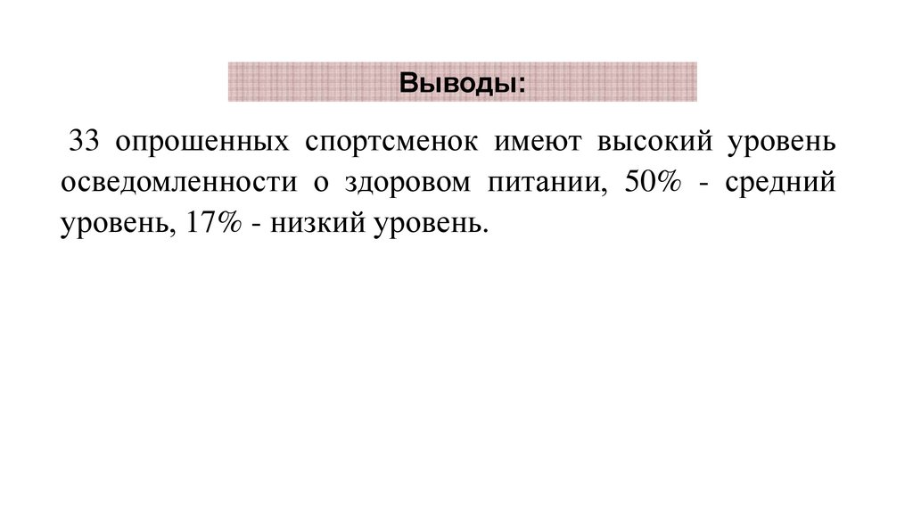 Выводы:33 опрошенных спортсменок имеют высокий уровень