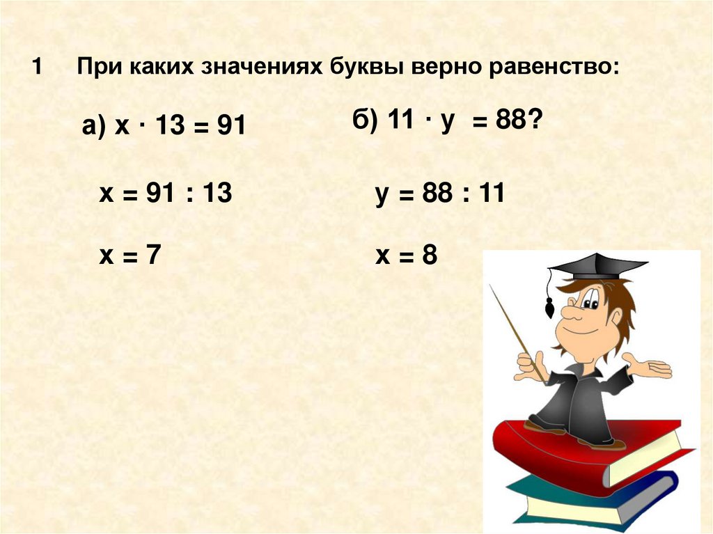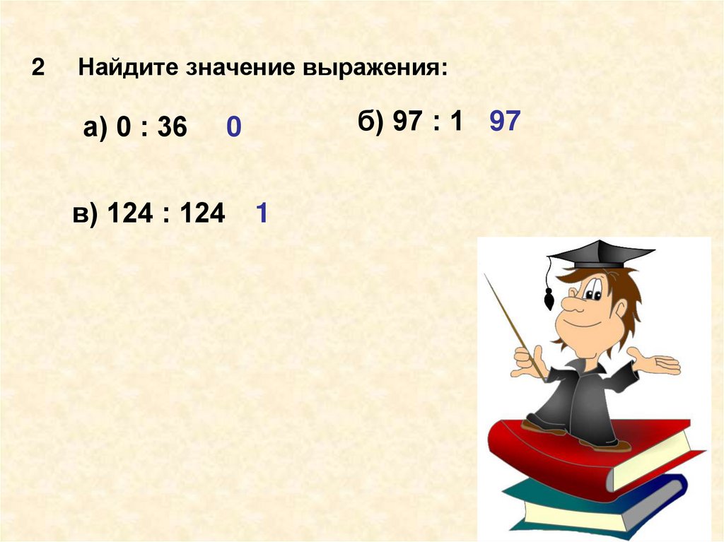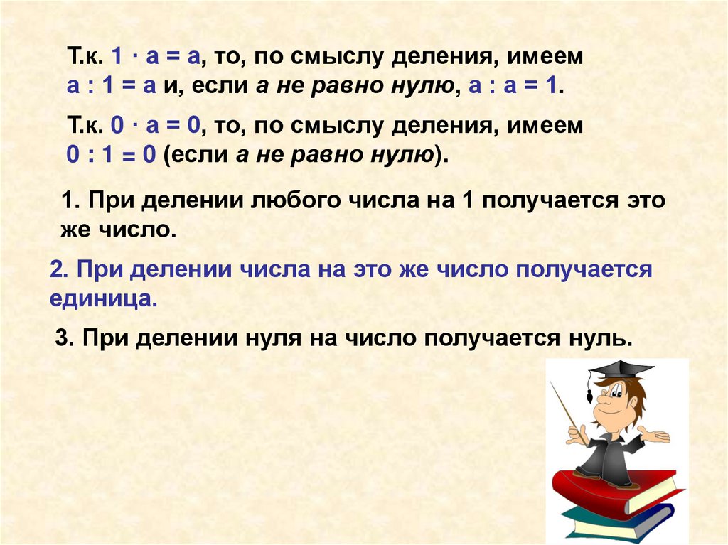 Т.к. 1 · а = а, то, по смыслу деления, имеема : 1 = а и, если а не равно нулю, а : а = 1.