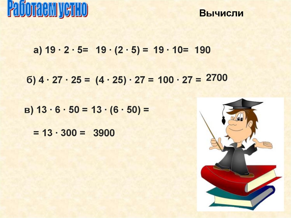б) 4 ∙ 27 ∙ 25 = (4 ∙ 25) ∙ 27 = 100 ∙ 27 = 2700