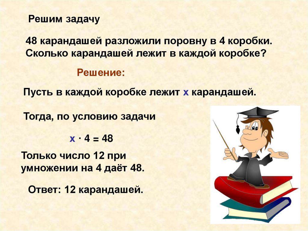 Решим задачу48 карандашей разложили поровну в 4 коробки.