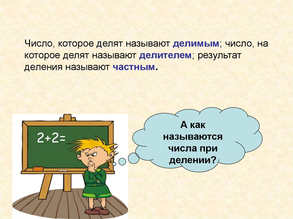 Число, которое делят называют делимым; число, накоторое делят называют делителем; результат