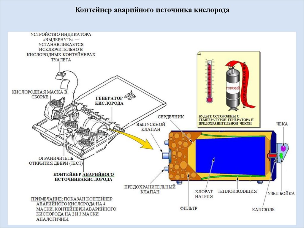 Каждый блок содержит химический генератор кислорода и две или более маски с