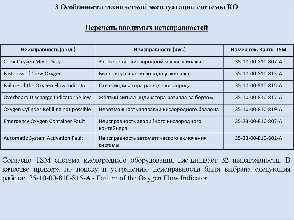 Согласно TSM система кислородного оборудования насчитывает 32 неисправности. В