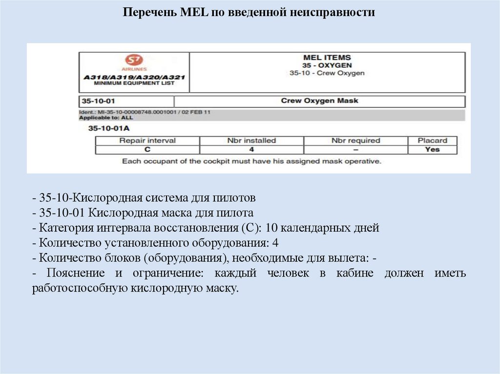 Перечень MEL по введенной неисправности- 35-10-Кислородная система для пилотов
