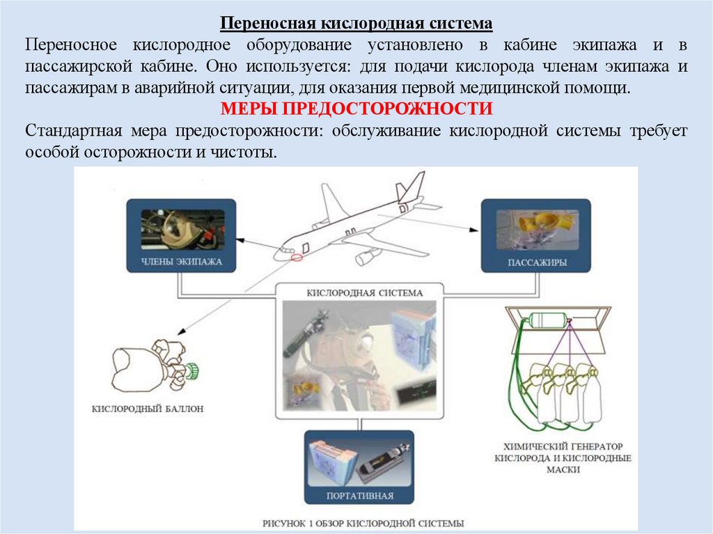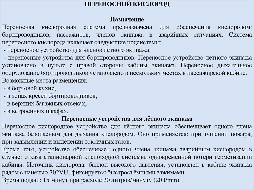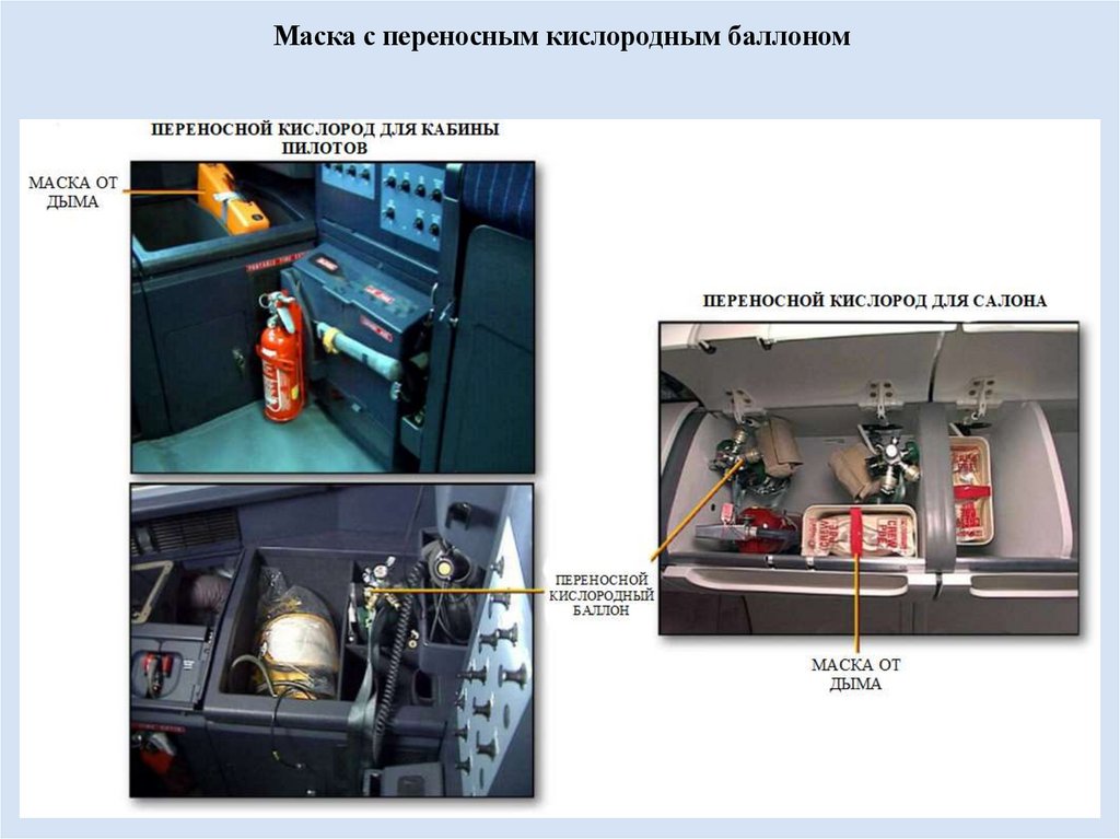 Переносная кислородная системаПереносное кислородное оборудование установлено в кабине экипажа и в