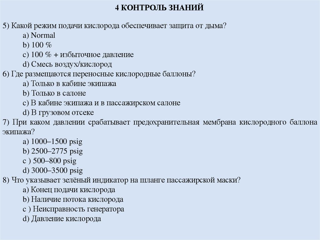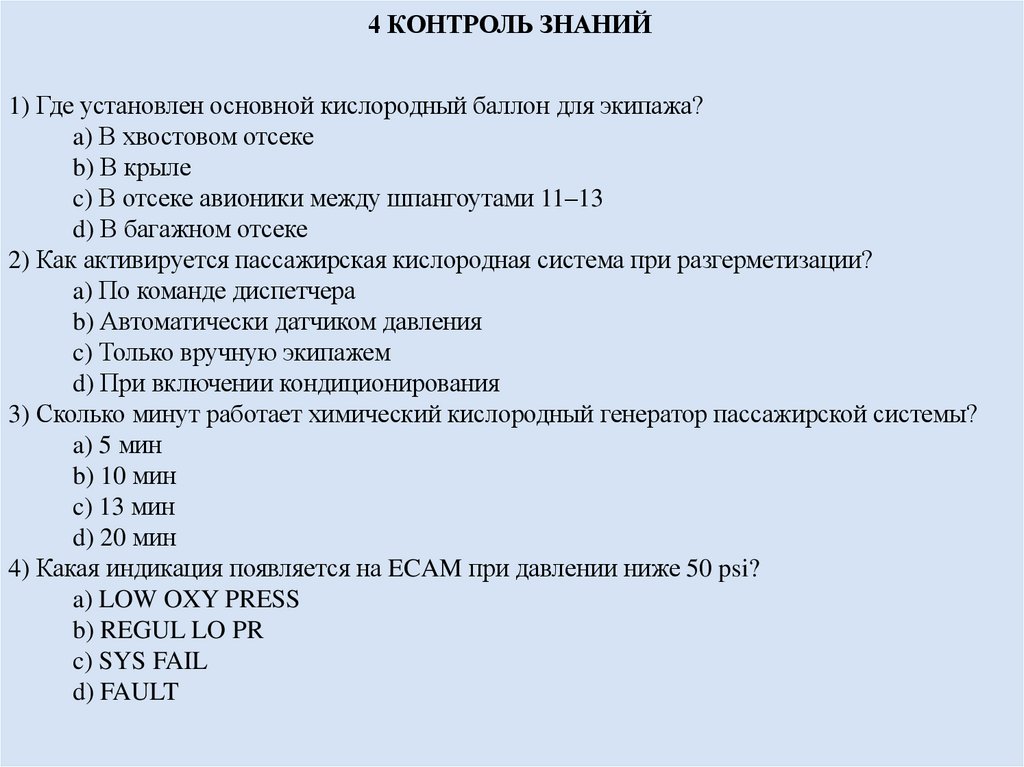 4 КОНТРОЛЬ ЗНАНИЙ1) Где установлен основной кислородный баллон для экипажа?