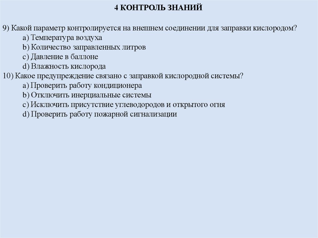 4 КОНТРОЛЬ ЗНАНИЙ9) Какой параметр контролируется на внешнем соединении для заправки кислородом?