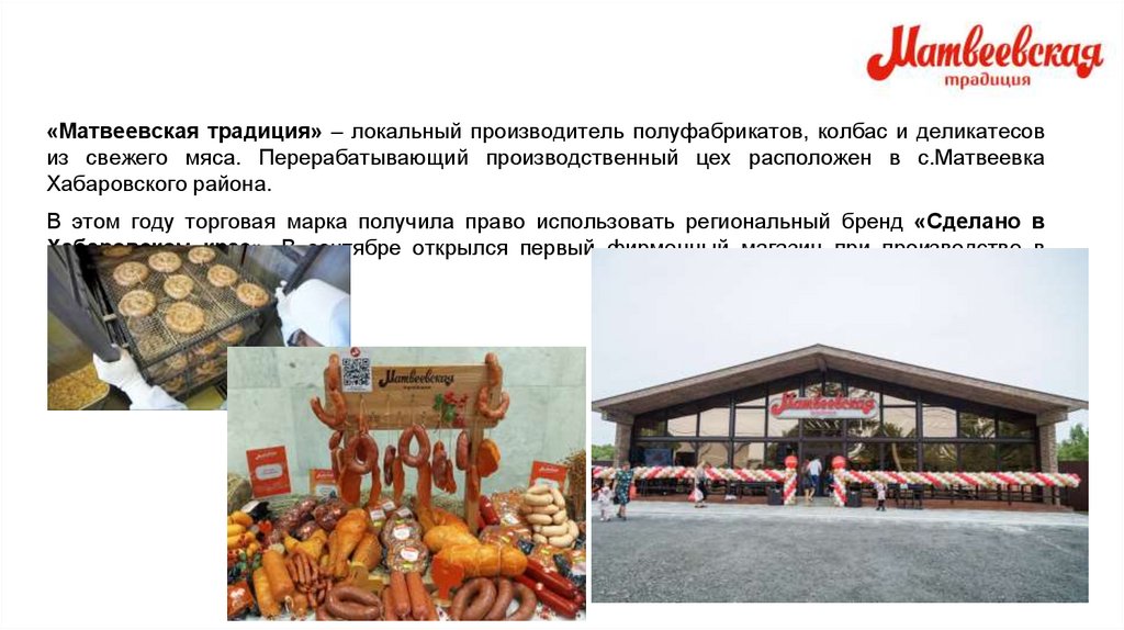 «Матвеевская традиция» – локальный производитель полуфабрикатов, колбас и деликатесовиз свежего мяса. Перерабатывающий производственный цех расположен в с.Матвеевка