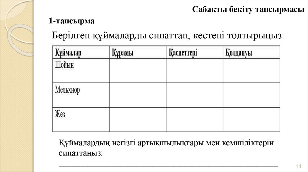 Берілген құймаларды сипаттап, кестені толтырыңыз:
