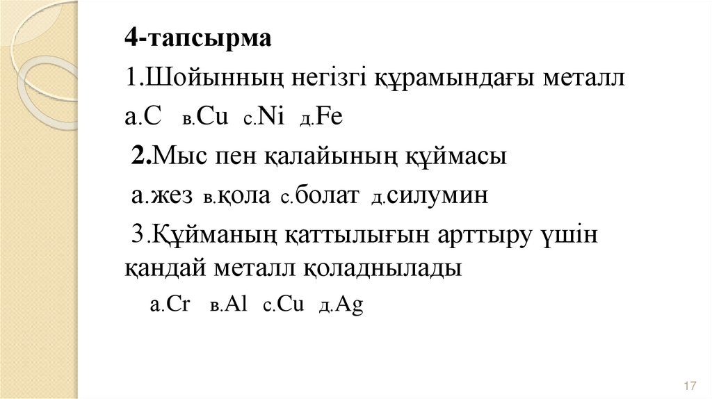 4-тапсырма1.Шойынның негізгі құрамындағы металл