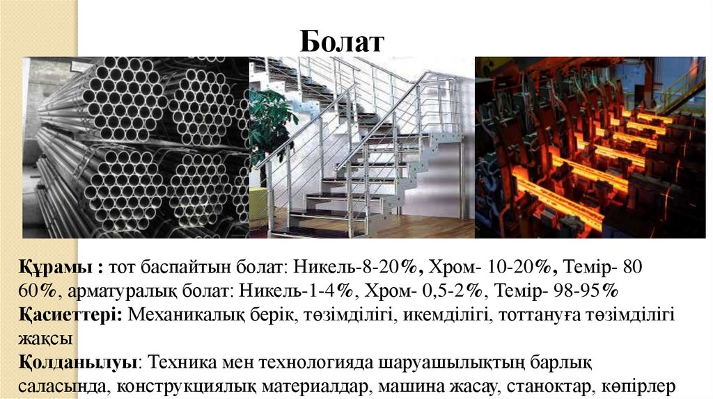 БолатҚұрамы : тот баспайтын болат: Никель-8-20%, Хром- 10-20%, Темір- 80