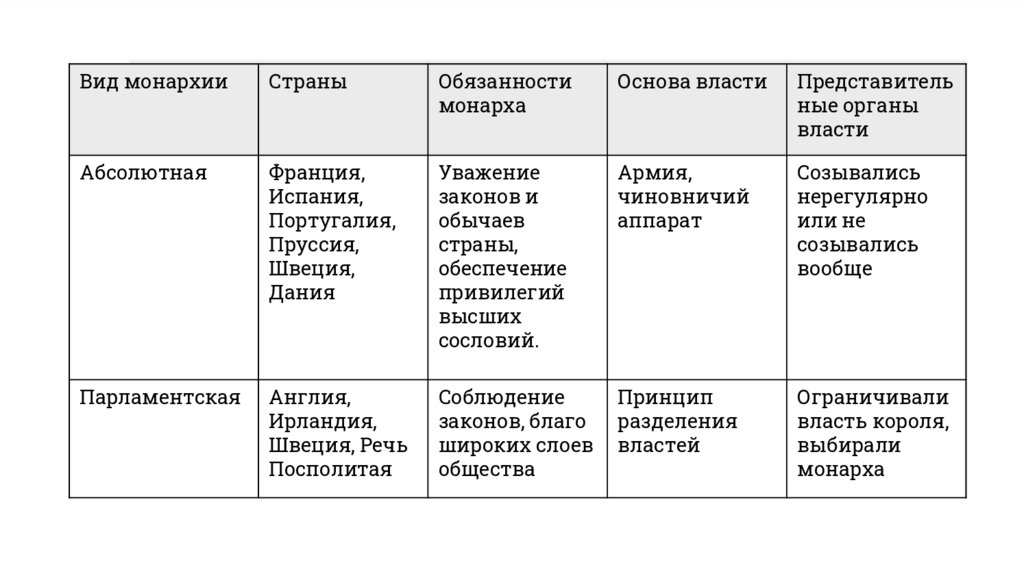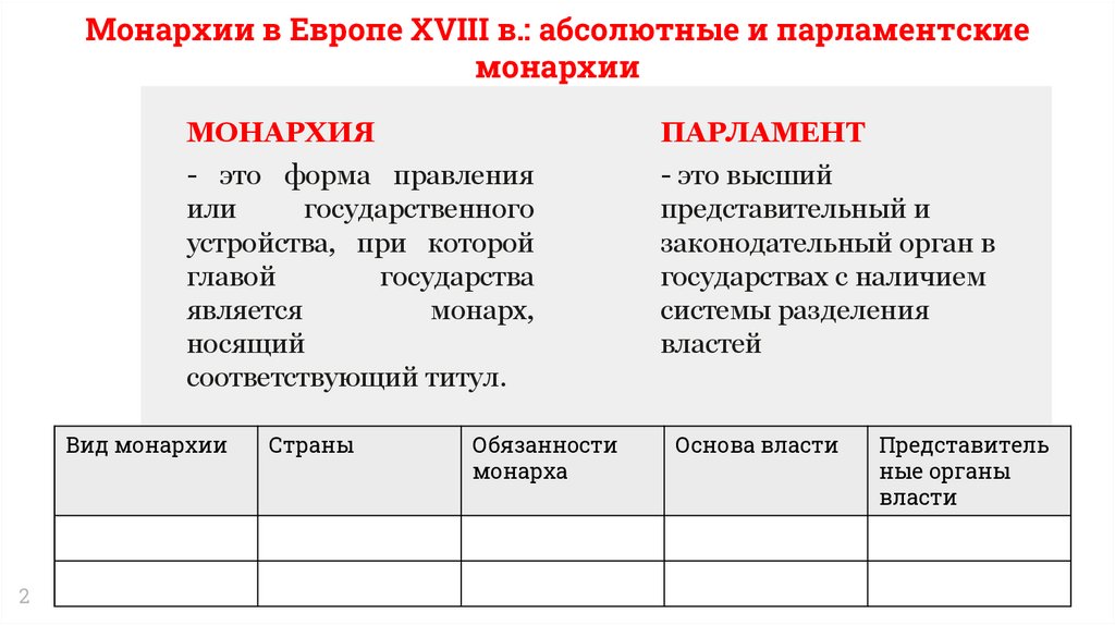 1. Монархии в Европе XVIII в.: абсолютные и парламентские монархии
