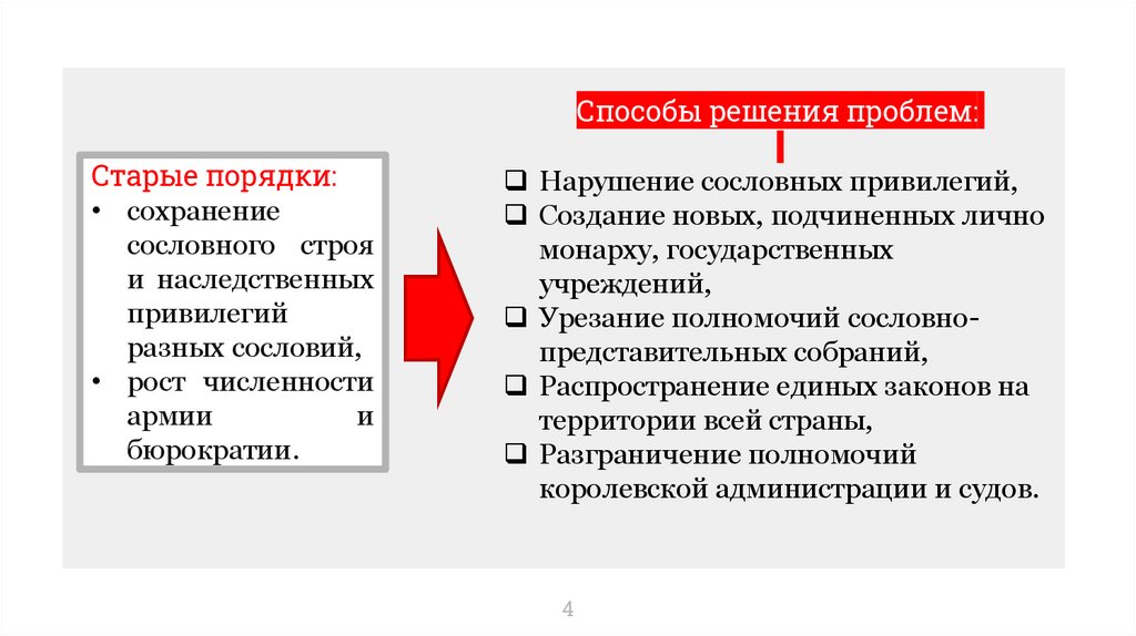 □ Устранение остатков средневекового строя;□ Монарх несет ответственность за всех