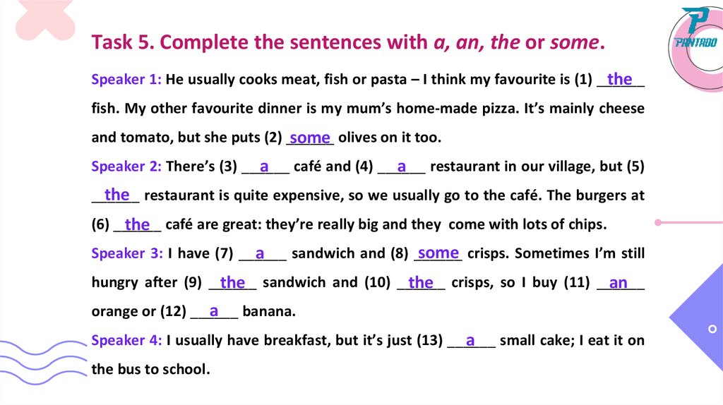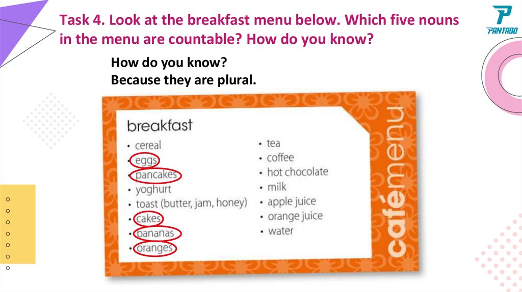 Task 4. Look at the breakfast menu below. Which five nounsin the menu are countable? How do you know?