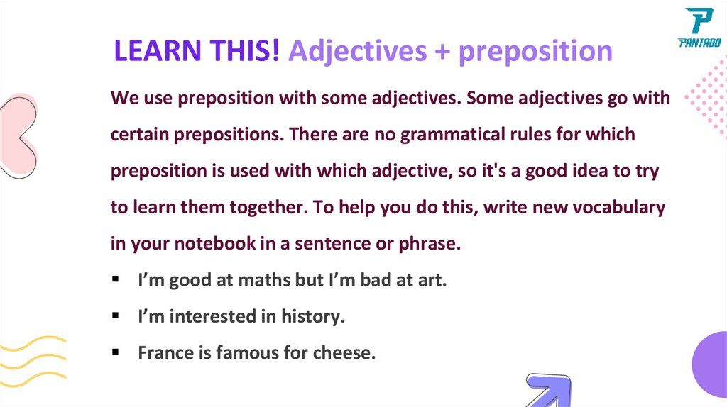 LEARN THIS! Adjectives + prepositionWe use preposition with some adjectives. Some adjectives go with