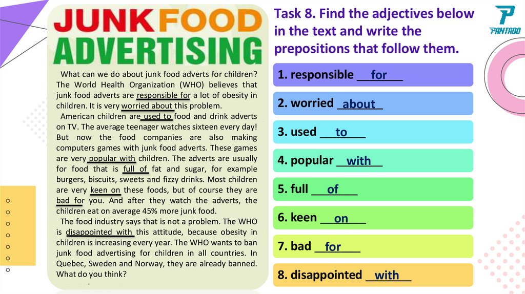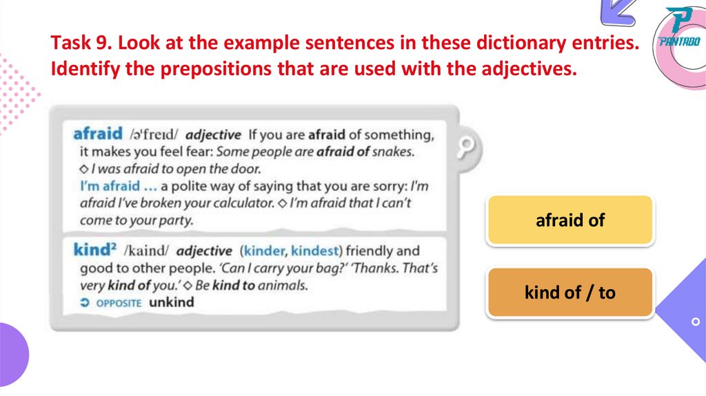 Task 9. Look at the example sentences in these dictionary entries.Identify the prepositions that are used with the adjectives.