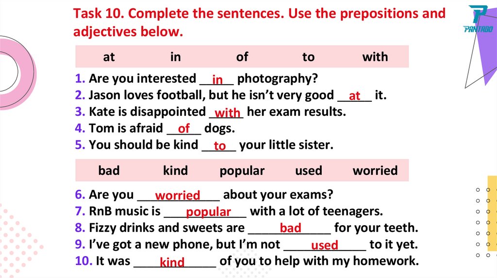 Task 10. Complete the sentences. Use the prepositions andadjectives below.