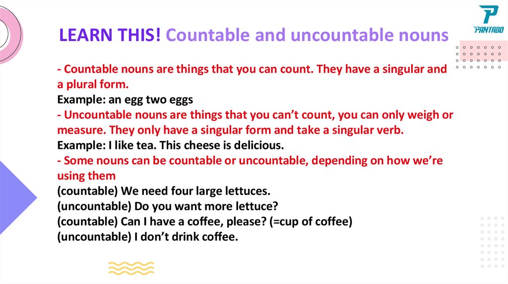 LEARN THIS! Countable and uncountable nouns- Countable nouns are things that you can count. They have a singular and