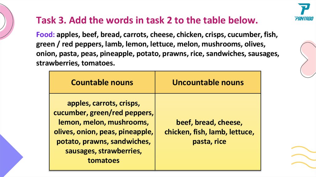 Task 3. Add the words in task 2 to the table below.Food: apples, beef, bread, carrots, cheese, chicken, crisps, cucumber, fish,