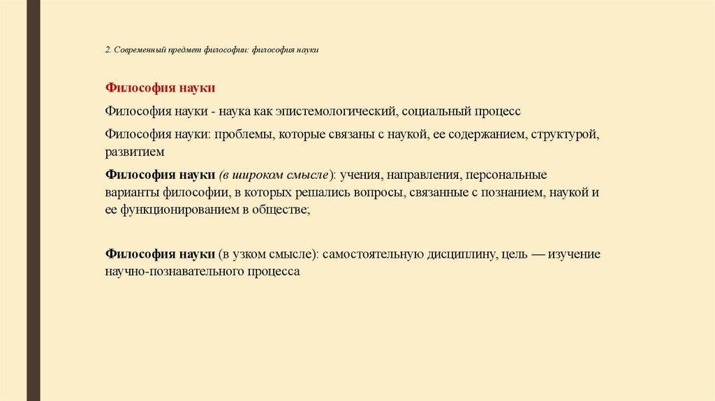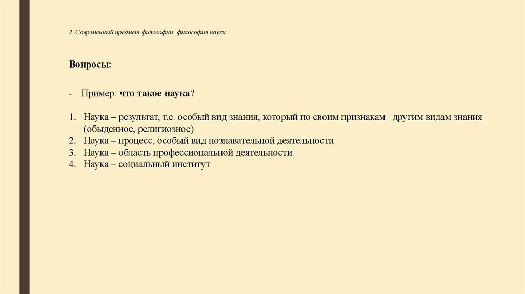 1. Наука – результат, т.е. особый вид знания, который по своим признакам другим видам знания