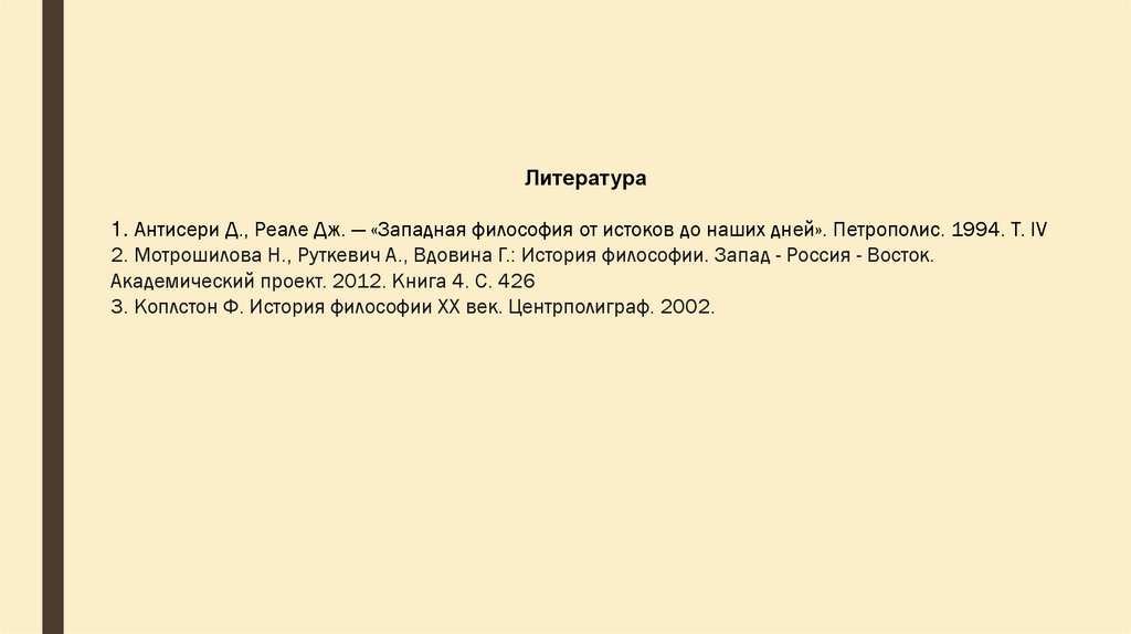Литература1. Антисери Д., Реале Дж. — «Западная философия от истоков до наших дней». Петрополис. 1994. Т. IV