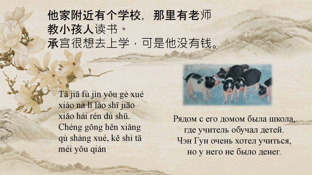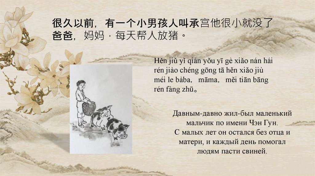 很久以前 有一个小男孩人叫承宫他很小就没了爸爸 妈妈 每天帮人放猪。