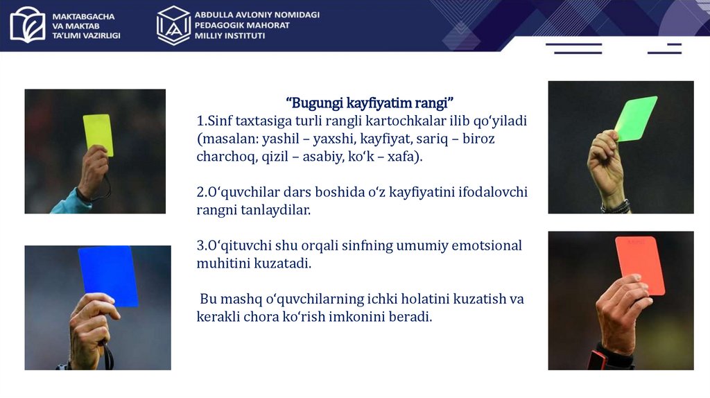 “Bugungi kayfiyatim rangi”1.Sinf taxtasiga turli rangli kartochkalar ilib qo‘yiladi
