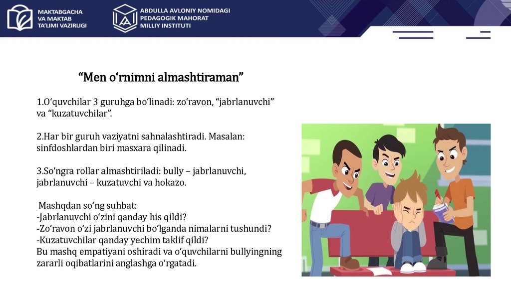 “Men o‘rnimni almashtiraman”1.O‘quvchilar 3 guruhga bo‘linadi: zo‘ravon, “jabrlanuvchi”