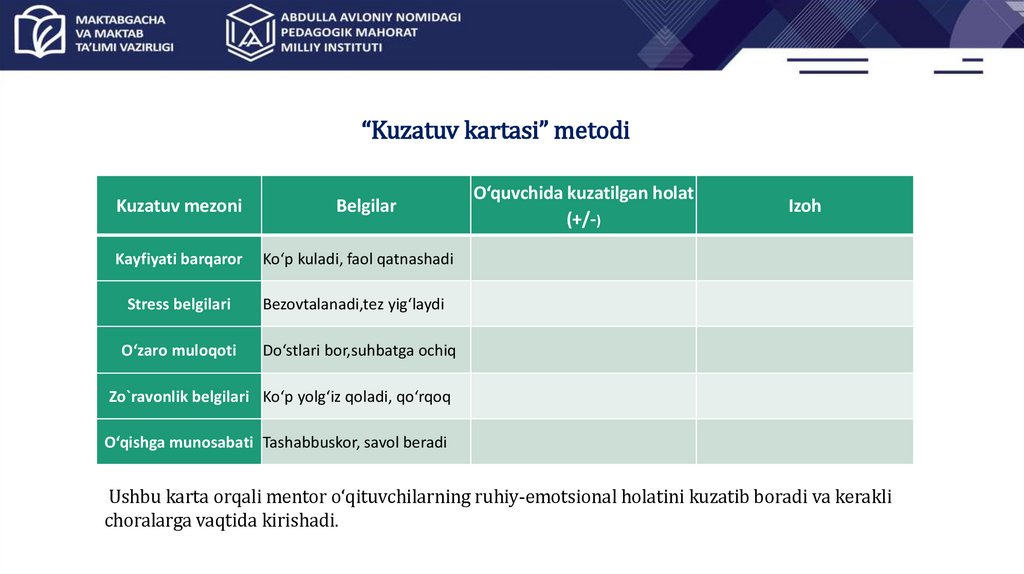 “Kuzatuv kartasi” metodiKuzatuv mezoni