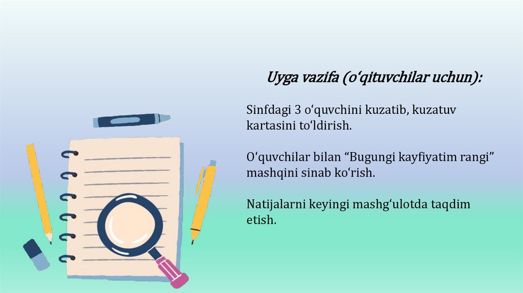 Uyga vazifa (o‘qituvchilar uchun):Sinfdagi 3 o‘quvchini kuzatib, kuzatuv