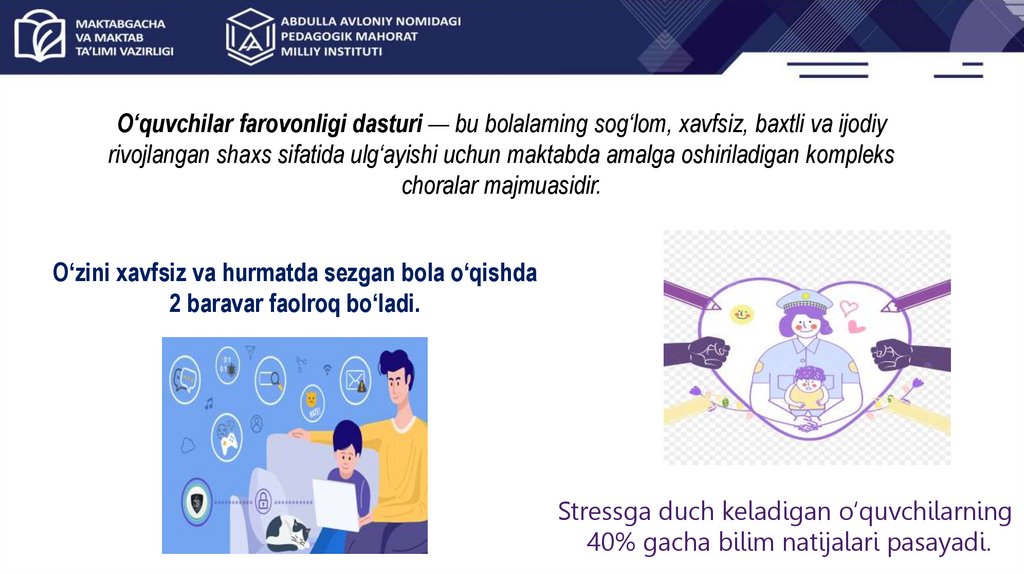 O‘quvchilar farovonligi dasturi — bu bolalarning sog‘lom, xavfsiz, baxtli va ijodiyrivojlangan shaxs sifatida ulg‘ayishi uchun maktabda amalga oshiriladigan kompleks