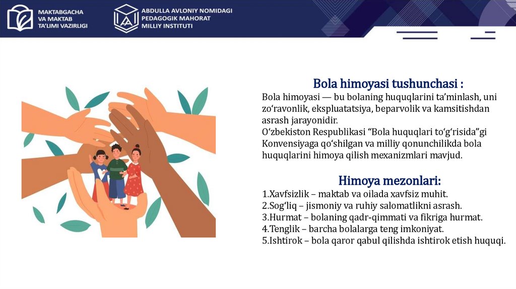Bola himoyasi tushunchasi :Bola himoyasi — bu bolaning huquqlarini ta’minlash, uni