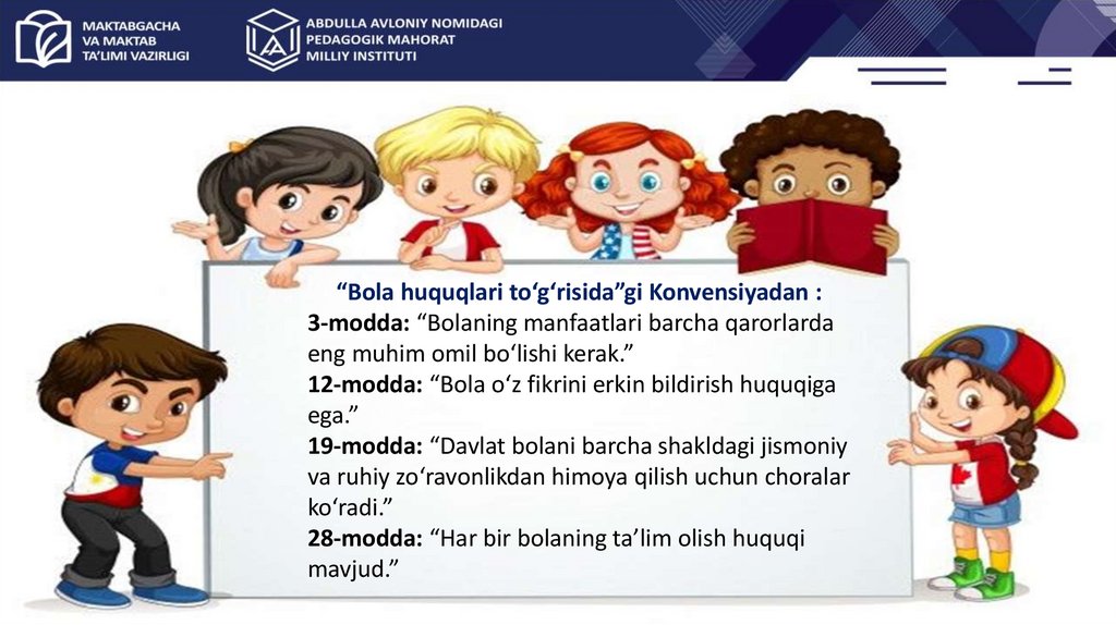 “Bola huquqlari to‘g‘risida”gi Konvensiyadan :3-modda: “Bolaning manfaatlari barcha qarorlarda