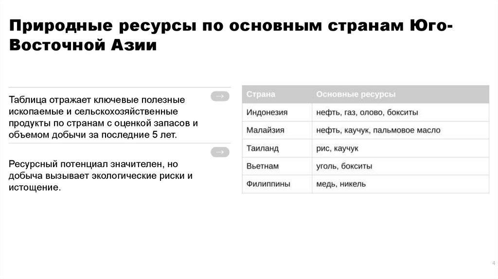 Природные ресурсы по основным странам ЮгоВосточной АзииТаблица отражает ключевые полезные
