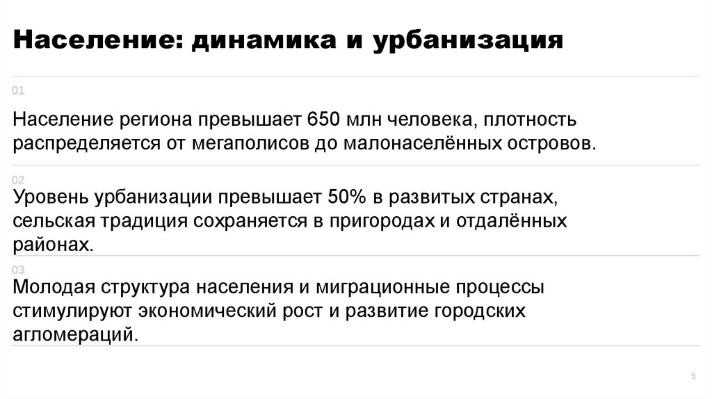Население: динамика и урбанизацияНаселение региона превышает 650 млн человека, плотность