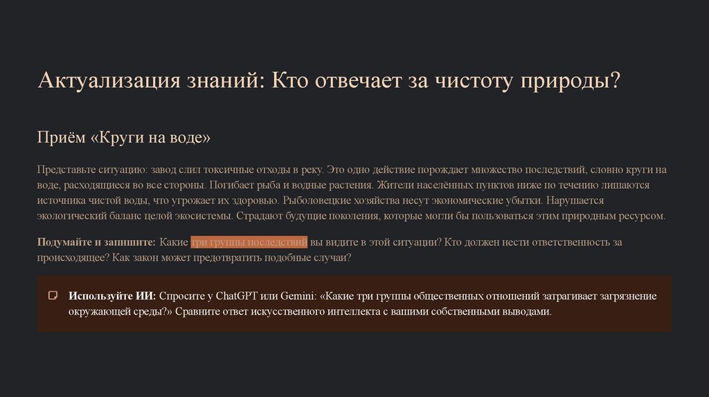 Используйте ИИ: Спросите у ChatGPT или Gemini: «Какие три группы общественных отношений затрагивает загрязнение
