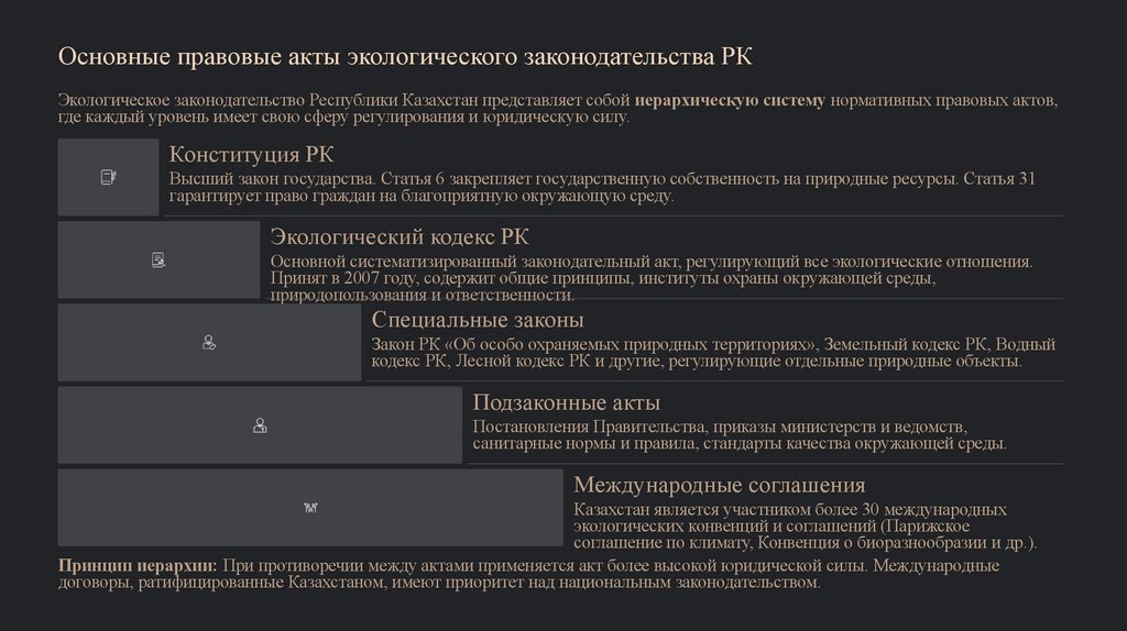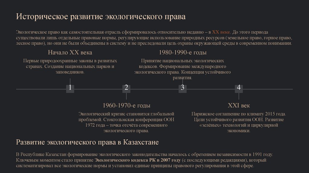 Историческая справка: В Казахстане экологическое право активно развивается с момента обретения независимости, особенно