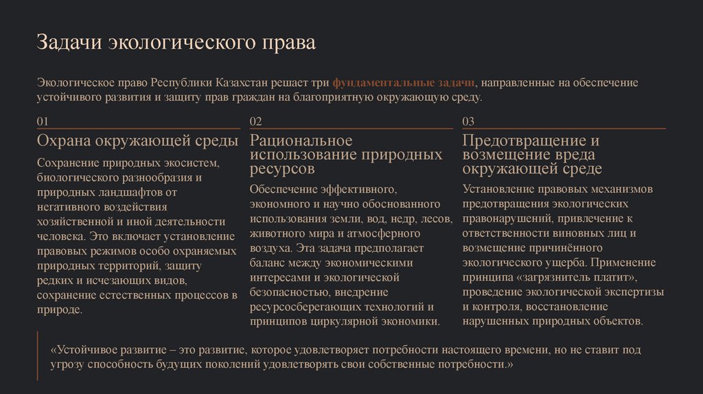 Задачи экологического праваЭкологическое право Республики Казахстан решает три фундаментальные задачи, направленные на обеспечение