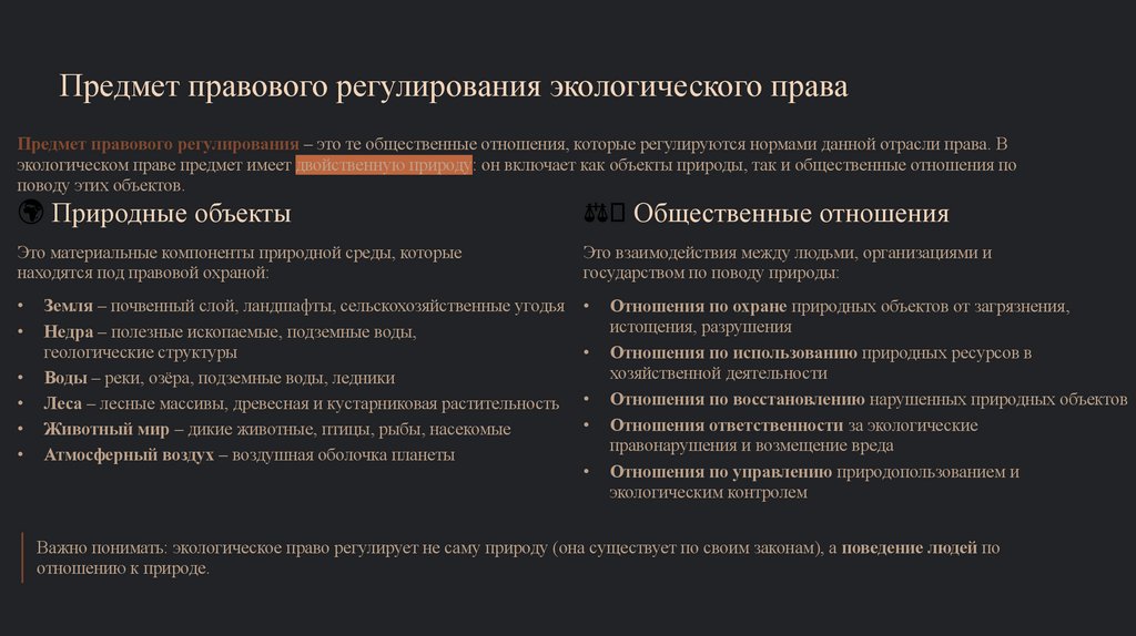 экологическом праве предмет имеет двойственную природу: он включает как объекты природы, так и общественные отношения по
