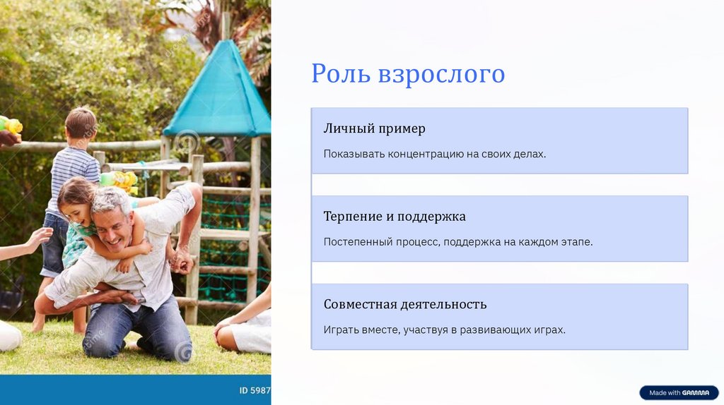 Стимулирующая среда, игровые методы, поддержка.