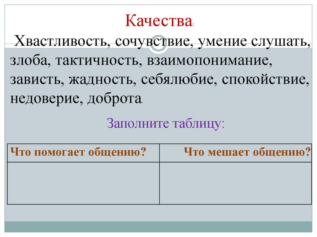 Хвастливость, сочувствие, умение слушать,